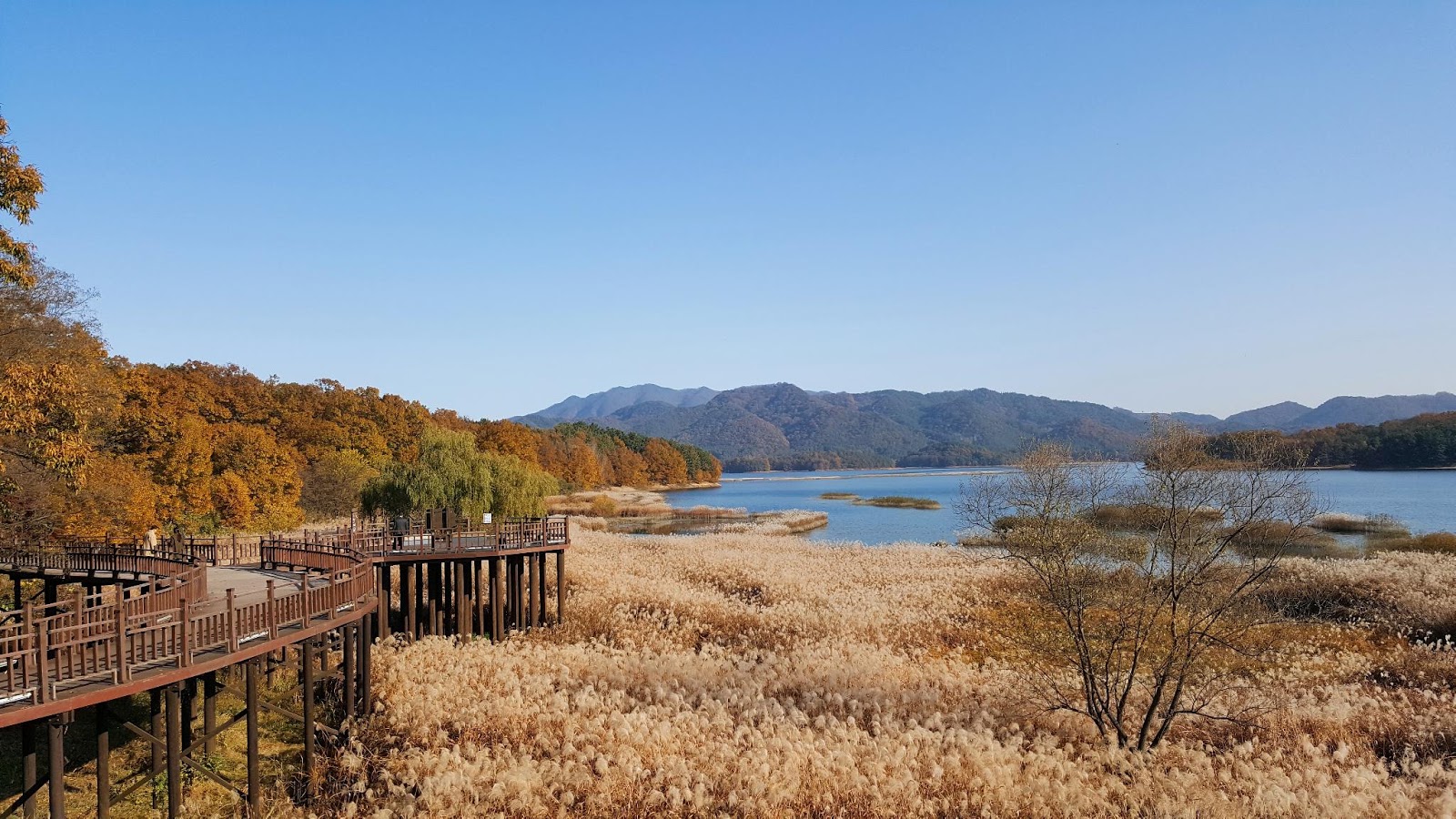 Du lịch Hàn Quốc đến đây, bạn có thể cảm nhận thanh âm êm đềm của sự yên tĩnh. Hình ảnh những người đi bộ lặng lẽ dọc theo con đường lát ván tạo nên khung cảnh như một bức tranh thủy mặc. Trong con đường quanh co dài 196 km, đoạn đường được tạo ra trong khu vực đi qua Daedeok-gu, Daejeon và Dong-gu được gọi là “Đường mòn hồ Daecheong”. Ngoài ra, mỗi tuyến đường đều có một chủ đề khiến việc khám phá không bị nhàm chán. Tuyến đường dài quanh hồ được khách đi tour Hàn Quốc yêu thích vì sự yên tĩnh, thỏa thích đắm chìm trong khung cảnh của những cánh đồng lau sậy tuyệt đẹp dọc theo hồ, sông, núi, cây cối, những thân cây khô duyên dáng trên mặt nước và một vài loài chim di cư ghé thăm hồ, cảm nhận làn gió mơn man.