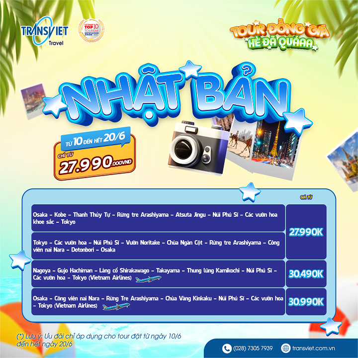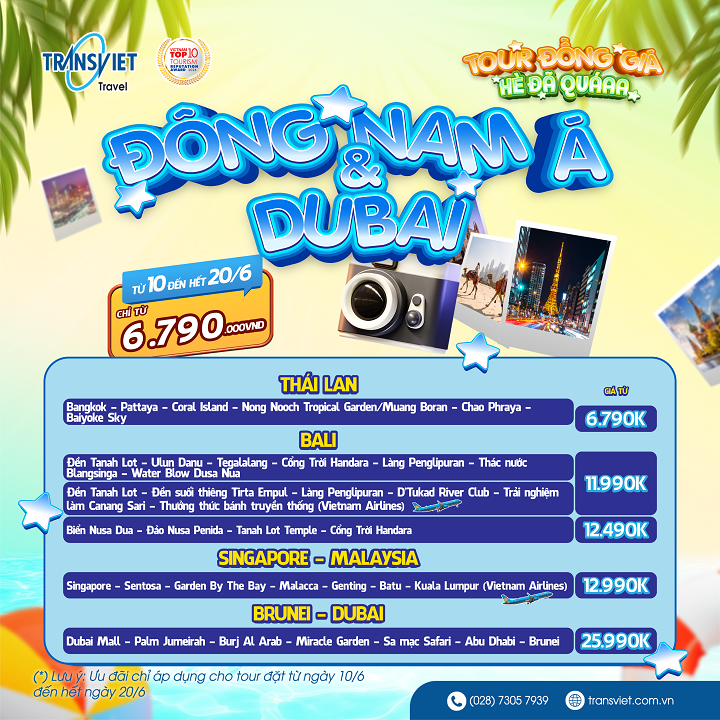Mùa hè là thời điểm lý tưởng để cùng người thân và bạn bè du lịch, thư giãn sau những tháng ngày bận rộn. Tuy nhiên, nhiều người vẫn còn lăn tăn về chi phí khi giá tour tăng cao vào mùa cao điểm. Hiểu được điều đó, TransViet mang đến chương trình "Tour Đồng Giá" – trọn gói, tiết kiệm, không lo phát sinh dành cho khách hàng đặt tour từ ngày 10 đến 20/6/2025.
