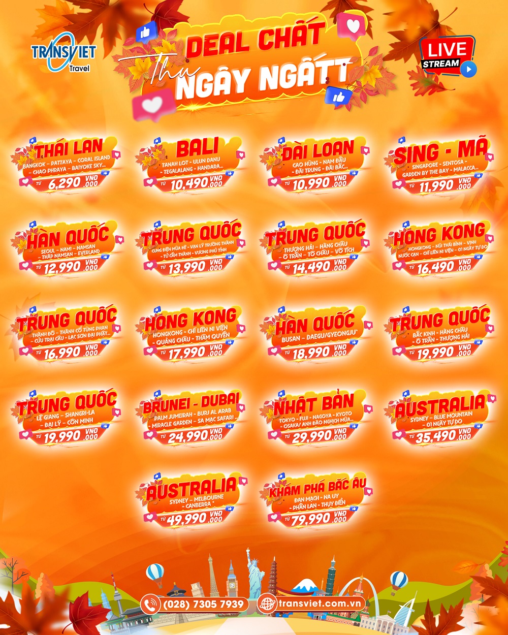 Mùa thu đang đến gần, cũng là lúc lý tưởng để lên kế hoạch cho những chuyến đi đáng nhớ. Với mong muốn mang đến cơ hội du lịch tiết kiệm nhưng chất lượng, TransViet tổ chức sự kiện livestream "Deal chất – Thu ngây ngất" vào ngày 29 tháng 7 năm 2025, hứa hẹn mang đến hàng loạt tour ưu đãi hấp dẫn và quà tặng giá trị cho khách hàng.