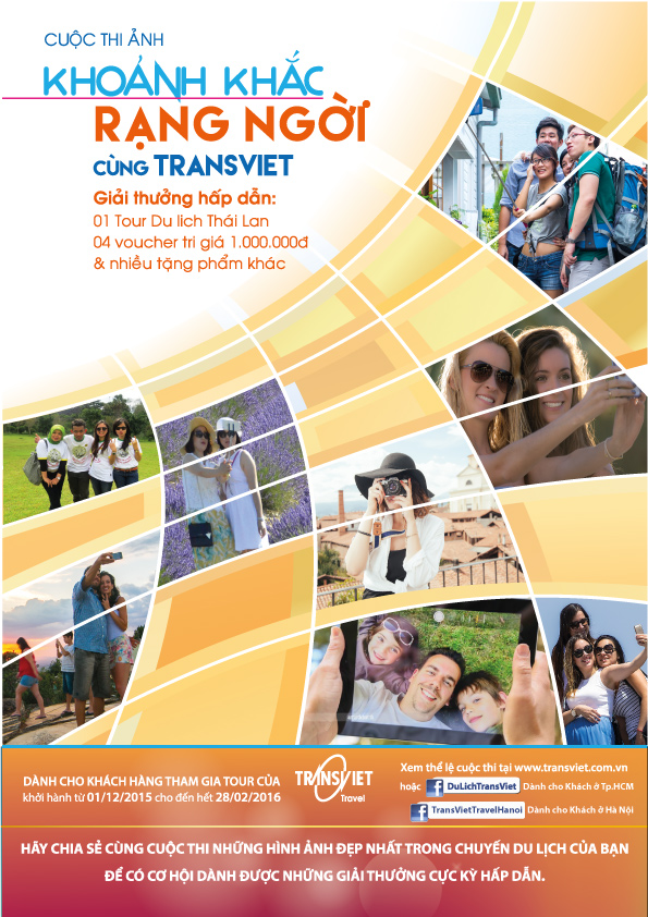 - Khách hàng gửi ảnh cá nhân hoặc ảnh chụp cùng bạn bè, gia đình tại các điểm du lịch trong các hành trình tour của TransViet về email khoanhkhactransviet@gmail.com hoặc tin nhắn Facebook Fanpage TransViet Travel kèm theo các thông tin sau:
