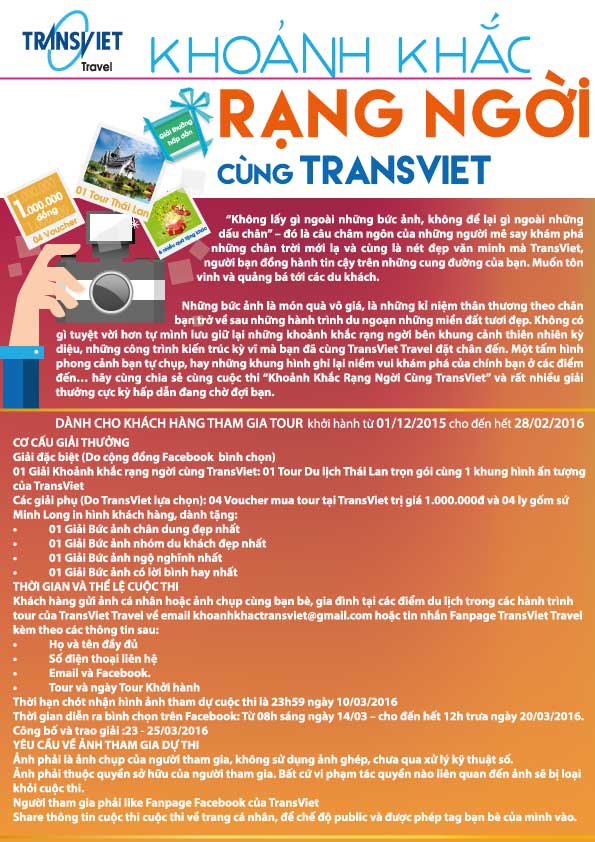 Những bức ảnh là món quà vô giá, là những kỉ niệm thân thương theo chân bạn trở về sau những hành trình du ngoạn những miền đất tươi đẹp. Không có gì tuyệt vời hơn tự mình lưu giữ lại những khoảnh khắc rạng ngời bên những khung cảnh thiên nhiên kỳ diệu , những công trình kiến trúc kỳ vĩ mà bạn đã cùng chúng tôi đặt chân đến. Một tấm hình phong cảnh bạn tự chụp, hay những khung hình ghi lại niềm vui khám phá của chính bạn ở các điểm đến………hãy cùng chia sẻ cùng cuộc thi “Khoảnh Khắc Rạng Ngời Cùng TransViet” và rất nhiều giải thưởng cực kỳ hấp dẫn đang chờ đợi bạn